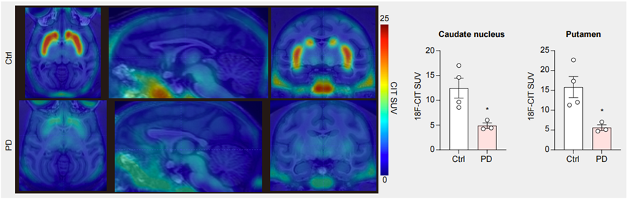 圖3. PET-CT結(jié)果顯示PD模型猴腦中多巴胺神經(jīng)元減少