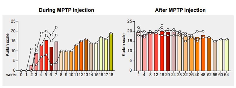 圖1. Kurlan評分顯示模型動物PD樣行為學(xué)癥狀出現(xiàn)迅速(左)。且造模后癥狀穩(wěn)定,持久(右)